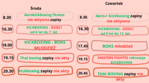 Zapraszamy dzieci oraz młodzież od 6lat (dziewczynki i chłopców) na zajęcia boksu i kick-boxingu. Treningi personalne i grupowe, dostosowane są do wieku, podział na oddzielne grupy według wieku oraz możliwości ćwiczących